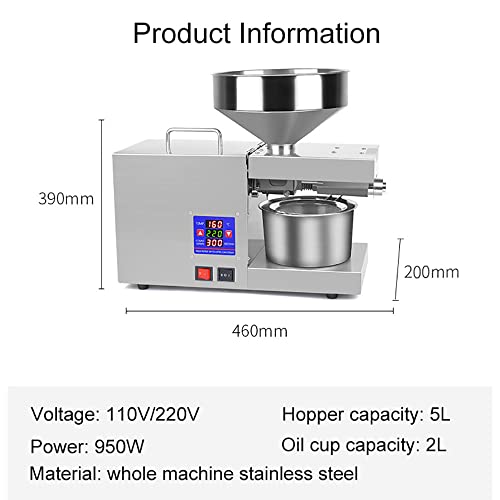 950W Oil Press Machine, Commercial Machine Hot And Cold Oil Presser for Peanut Sunflower Walnut Beans Sesame Seeds, Intelligent Digital Temperature Control,5L Capacity, 5-8kg/h, 24h Continuous Work