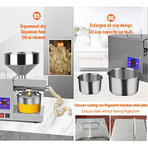 【Designed For Pressing Healthy Oil】The use of Screw spiral design, pure physical crush can ensure the integrity of oil particles on the basis of the complete retention of vegetable oil natural nutrients, you can easily enjoy healthy oils at home. Neither the raw material or oil would touch any plastic parts, which ensures the purity and healthiness of oil.