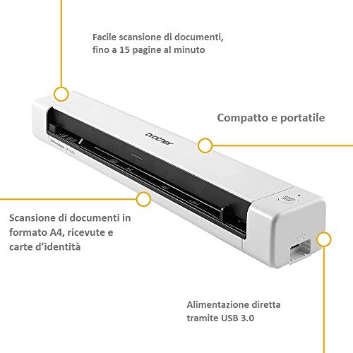 Brother DS640 Scanner Portatile, A4, Risoluzione 600 x 600 dpi, 15 ppm B/N e Colore, Autoalimentato Tramite USB