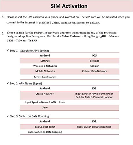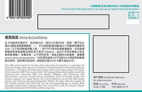 China Unicomm – Cina, Hong Kong, Macau, Taiwan 3G / 4G Prepaid (Solo dati) SIM Card – 6 GB Dati (Poi Ridotto a 128 k/s) – 30 Giorni