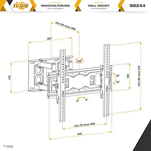 ✅ FUNZIONI: Porta TV snodabile per televisioni è orientabile 120 gradi, se la larghezza dello schermo è 50cm max. Inclinazione regolabile da +/-15 gradi. Distanza dalla parete 95-365mm. Per una regolazione ottimale, il pannello frontale dello sostegno è rotante di +/-3 gradi