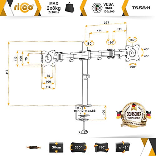 ✅ CAPACITÀ: Porta schermo è resistente fino 8kg per arm. All montaggio de 2 schermi, larghezza max è 720mm. Adatto per VESA standard 75×75 e 100×100